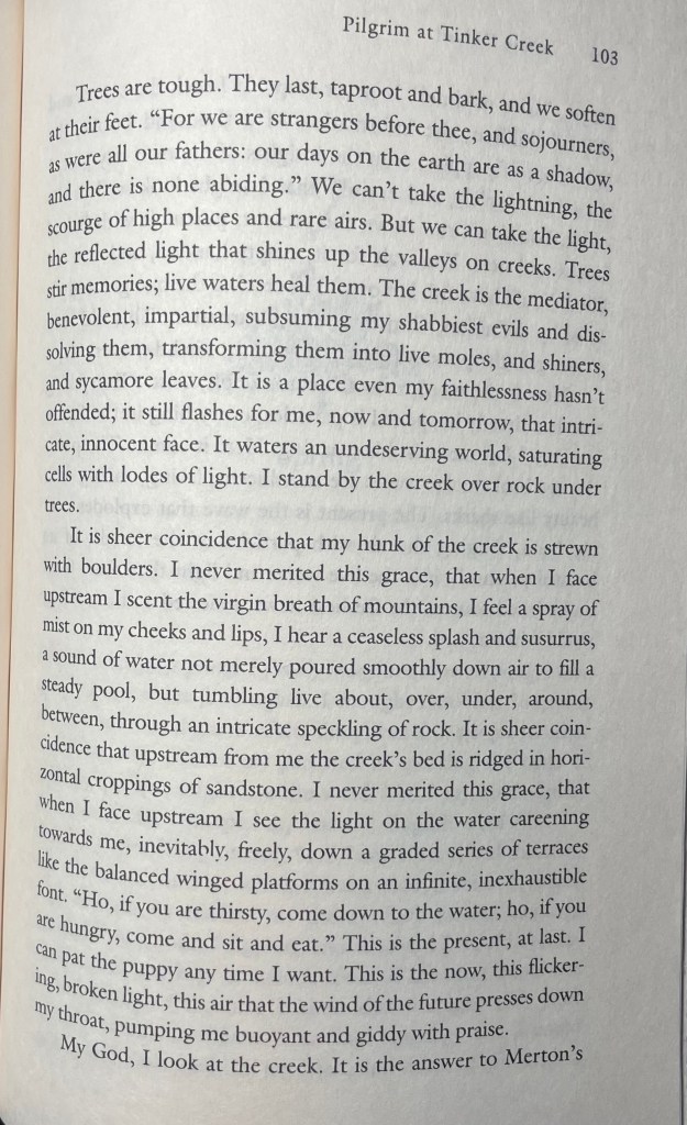 You know, when you hear the author say of herself that the book The Strange Lives of Familiar Insects (p. 170) is a book that she could not live without, that you are in for a different kind of literary adventure. I learned in the Afterword that Annie Dillard was 27 years old when she began writing The Pilgrim at Tinker Creek – for perspective, this is the age of my first born child, also a woman like Annie Dillard, with some powerful gifts with words. Yet Annie Dillard’s gift with words is true fecundity – like the title of ch 10 using this term – they have the ability to “produce many new ideas; an abundance of new growth, or fertility.” She employs words to do OH SO MUCH more than communicate her profound power of observation and contemplation of nature, but also envelop complexity (at times to the degree of befuddlement, at least for me) from her extensive reading and research. In one moment I was moved to tears by the shear intense beauty of her words, and other moments tattered by being “forced to drink too much from a fire hose” or whiplashed because when I thought I was being directed to consider the implausibility of the force and growth-rate of plant roots, for example, I am the next moment trying to process biblical illusion or non-Platonic philosophy. Her writing is extraordinary, and it would be simply remiss to not hear a significant portion read aloud. I have chosen this excerpt from her chapter titled “The Present” :